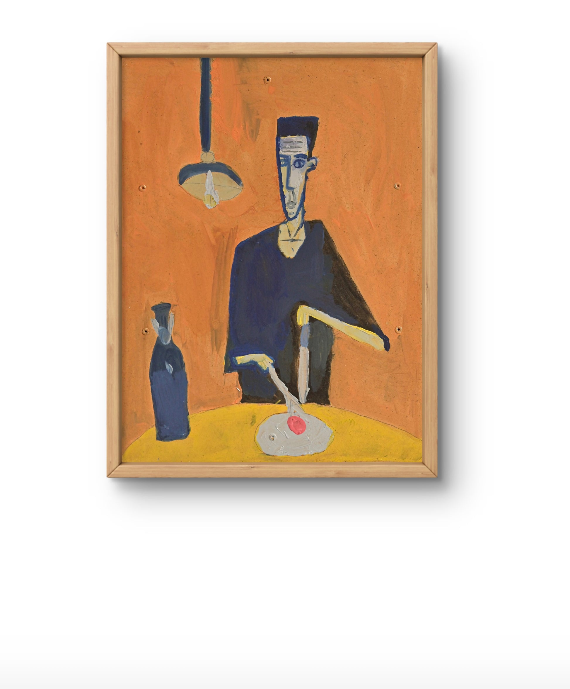 The setting is reduced to essentials: a yellow table, a dark bottle, a suspended lamp. The egg at the center becomes a fragile symbolic focal point. The intense orange background heightens the emotional tension of the scene.