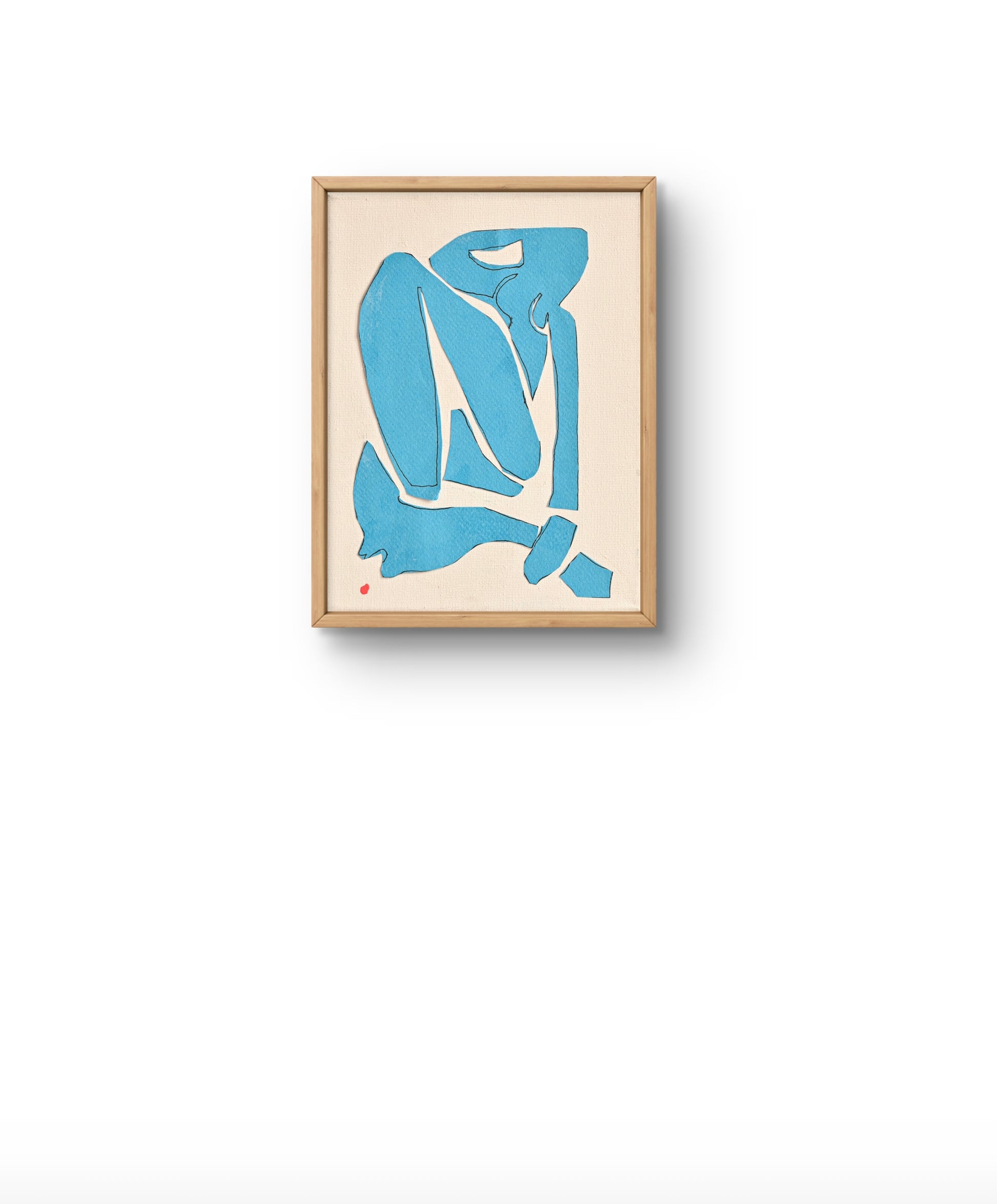 🇮🇹 Descrizione: La figura ritagliata in campiture blu intense rimanda immediatamente ai celebri “Nu bleu” di Henri Matisse, in particolare alla fase dei papiers découpés realizzati negli ultimi anni della sua vita.