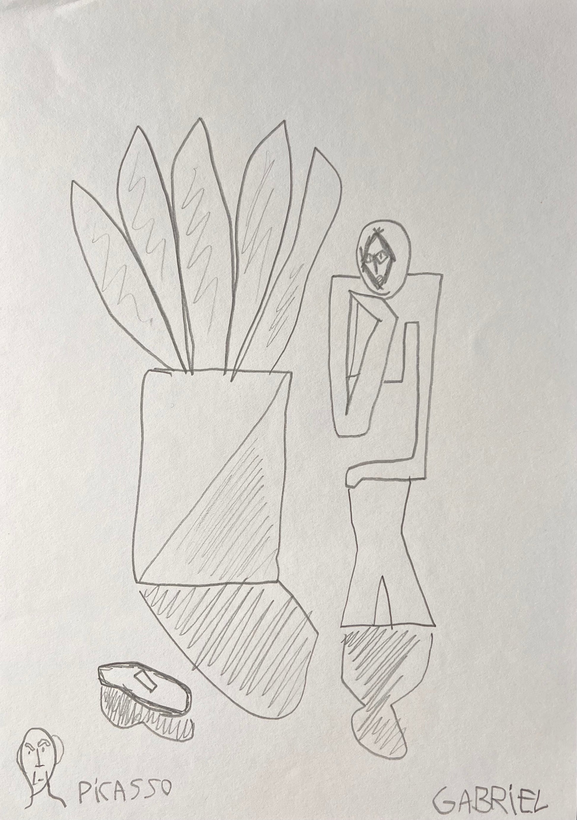 The time constraint intensifies the synthesis: the drawing does not seek resemblance but structure. Gabriel does not imitate Picasso; he activates the principle of decomposition and constructive logic.